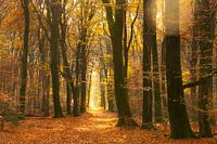 Pad door een goudkleurig bos tijdens een mooie zonnige herfstdag De bosgrond van het Speulder- en Sprielderbos in natuurgebied de Veluwe is bedekt met bruin en geel gevallen blad en het pad verdwijnt in de verte. Het zonlicht en de mist geven het bos een prachtige herfstsfeer.