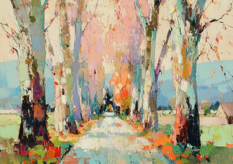 Dit impressionistische schilderij toont een landelijk pad dat zich uitstrekt van de voorgrond tot in de verte, geflankeerd door hoge, slanke bomen met kleurrijke, getextureerde stammen. Brede, expressieve penseelstreken vormen groen, oranje en rood gebladerte dat beweging en levendigheid uitstraalt. De lucht is geschilderd in zacht blauw en roze, met wolkentinten, terwijl verre heuvels en gebouwen op de achtergrond vervagen in zachte aardetinten. De losse, gestuele schilderstijl met zichtbare kleurlagen en impasto-effecten benadrukt licht, schaduw en diepte. De harmonieuze compositie straalt rust, natuurlijke schoonheid en een dynamische indruk uit.