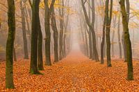 Pad door een mistig beuken landschap tijdens een prachtige herfstochtend in het bos in het Gelderse natuurgebied de Veluwe.