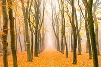 Pad door een mistig beuken landschap tijdens een prachtige herfstochtend in het bos in het Gelderse natuurgebied de Veluwe.