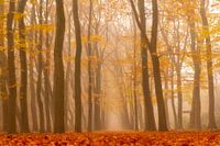 Pad door een mistig beukenlandschap tijdens een mooie herfstochtend in het Gelderse natuurgebied de Veluwe.