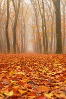 Pad door een mistig beukenlandschap tijdens een mooie herfstochtend in natuurgebied de Veluwe in Gelderland, Nederland.