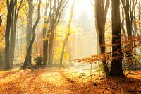 Pad door een mistig bos tijdens een mooie mistige herfstdag. De bosgrond van het Speulder- en Sprielderbos in het Veluwse natuurgebied is bedekt met bruin gevallen bladeren en het pad verdwijnt in de verte. De mist geeft het bos een desolate sfeer.