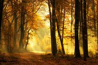 Pad door een mistig bos tijdens een mooie mistige herfstdag. De bosgrond van het Speulder- en Sprielderbos in het Veluwse natuurgebied is bedekt met bruin gevallen bladeren en het pad verdwijnt in de verte. De mist geeft het bos een desolate sfeer.