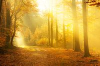 Pad door een mistig bos tijdens een mooie mistige herfstdag. De bosgrond van het Speulder- en Sprielderbos in het Veluwse natuurgebied is bedekt met bruin gevallen bladeren en het pad verdwijnt in de verte. De mist geeft het bos een desolate sfeer.