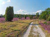Wandelpad door het bloeiende heidelandschap op de Lüneburger Heide.