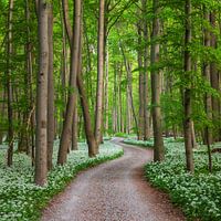 Een pad slingert door het beukenbos in het Hainich National Park. De rand van het pad is afgezoomd met bloeiende wilde knoflook, die zijn geur door het hele bos verspreidt.
