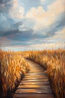 Een gouden houten wandelpad baant zich een weg door een zee van hoog, fluisterend gras dat danst in de zachte wind. Indrukwekkende wolkenformaties spreiden zich uit over de horizon, terwijl het licht van de zon zachtjes door het landschap breekt en een vredige, bijna magische sfeer creëert. Het pad nodigt je uit om te ontdekken en te…