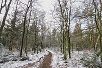 mooi winters landschap, koud en kaal. Klein paadje door het dichte bos. Het pad slingert mooi weg.