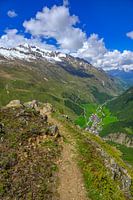 Uitzicht vanaf een pad hoog in de bergen op het bergbeklimmersdorp Vent in het Ötztal in Tirol Oostenrijk tijdens een mooie lentedag in de Alpen. Vent is een van de Bergsteigerdorpen in de Oostenrijkse Alpen. "Bergsteigerdorf" betekent vanuit het Duits vertaald naar het Engels "bergbeklimmersdorp" of "bergbeklimmersdorp". Deze dorpen liggen meestal in bergachtige gebieden en zijn gewijd aan het bevorderen van duurzaam en verantwoord bergbeklimmingstoerisme.