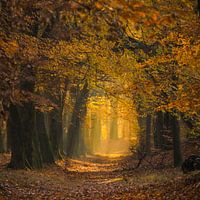 Voetpad door een beukenbos tijdens een vroege herfstochtend in het Leuvenumse Bos in het Veluwse natuurgebied.