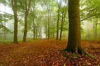 Voetpad in een sfeervol bos met groene bladeren aan de bomen in de herfst met een mist in de lucht. De mist geeft het bos een magische sfeer met de bladeren die net van kleur beginnen te veranderen tijdens deze vroege herfstdag in het Kloosterbos in Gelderland.