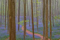 Kronkelend pad in het Hallerbos op de vroege ochtend met nevel. De grond is bedekt met bloeiende wilde Hyacinten.