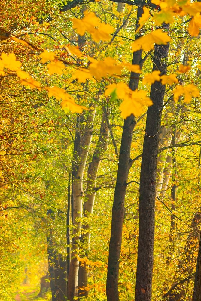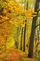 Pad langs bosbomenlaan met gele herfstbladeren