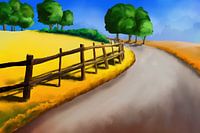 Digitaal schilderij van een landschap met velden, een pad langs een hek, bomen en bergen op de achtergrond.