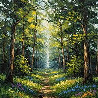 Stap in een zonovergoten droom met dit prachtige impressionistische olieverfschilderij. Dit werk is gemaakt met een dynamische paletmes-techniek en brengt een levendige, driedimensionale textuur tot leven. Een kronkelend pad trekt het oog diep een weelderig bos in, waar torenhoge bomen met rijke, getextureerde schors een natuurlijke boog vormen. Zonlicht stroomt door het bladerdak, verlicht de levendige groene en gele bladeren en creëert een gevoel van hoop en ontdekking. De voorgrond is een tapijt van wilde bloemen in briljant blauw, paars en geel, die je uitnodigen om in dit serene en magische landschap te wandelen. Dit kunstwerk vangt de vredige schoonheid en rust van een verborgen bospad, waardoor het een perfecte aanvulling is voor degenen die een vleugje van de natuur's majesteit en licht in hun huis willen brengen.