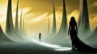 In een somber, buitenaards landschap lopen twee vrouwen over een pad dat leidt naar een mysterieuze buitenaardse stad. De silhouetten van de twee figuren steken af tegen de verre horizon, terwijl de indrukwekkende, torenhoge structuren van de stad zowel bedreigend als fascinerend lijken. Het beeld straalt een gevoel van avontuur en…