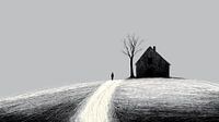 Minimalistische illustratie van een eenzame man die over een lang, kronkelig pad loopt en een klein, donker huis op een heuvel nadert. De sombere sfeer en minimalistische details creëren een gevoel van isolatie en mysterie. Perfect voor thema's als eenzaamheid, avontuur of innerlijke reizen.