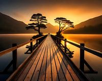 Het tafereel toont een rustige houten brug die zachtjes over een stil meer leidt, wat het beeld een tijdloze, bijna meditatieve kwaliteit geeft. De planken zijn vergrijsd door het weer, hun nerven en kleine scheuren vertellen van vele seizoenen; de reling werpt fijne, grafische schaduwen op het oppervlak terwijl de kijker over de brug…