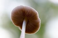 Sprookjesachtige sfeervolle foto van een paddenstoel in Nederland, vanaf de onderkant gefotografeerd, waardoor de ribben van de hoed met de lamellen goed zichtbaar zijn.