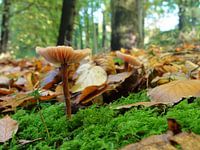 Paddenstoel omringd door herfstblad op landgoed Elswout