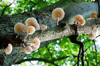 De structuur onderaan de paddenstoel geeft een speciaal effect. Het contrast van deze kleur met de boomstam en de bokeh achtergrond van de groene bladeren van de bomen maakt het een magisch geheel.