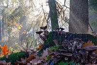 Paddenstoelen in de zonnige herfst, mistige ochtend - Honingzwam op boomstronk in bos en gouden bladeren