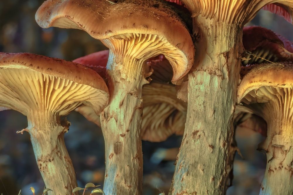 De gekweekte witte champignon, is de standaard naam voor de paddestoel Agaricus bisporus. Dit groepje paddenstoelen stond in een goede staat met alle details knus bij elkaar in het bos. Het licht scheen er zo mooi op die dag. De sfeer is wat dromerig en rustig, de aardtinten zijn mooi. Het was windstil.