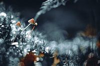 Paddenstoelen in het mos. Weinig kleur, vooral bruin en blauw.