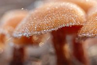 Paddenstoelen met veel ijskristallen in het bos.