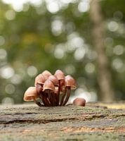 Groepje paddenstoelen op een boomstam met mooie bokeh op de achtergrond
