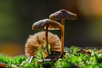 Herfstfoto van twee paddenstoelen die op het groene mos naast elkaar staan. Op de achtergrond is de hoed van een omgevallen paddenstoel zichtbaar.