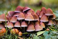 Close-up van een groep paddenstoelen op een vochtige herfstochtend.