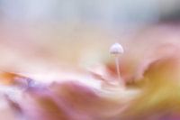 Heel klein paddenstoeltje tussen de bladeren, die in de herfst van de bomen zijn gevallen. Heel laag op de grond maakte ik deze foto, waardoor het lijkt of het paddenstoeltje in kleurrijke golven staat.