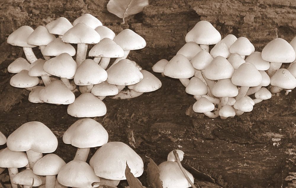 Paddestoeltjes groeiend op een boomstam omringd door bladeren in sepia.