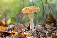 Een echte! Rood met witte stippen paddestoel steeds fier boven de herfstbladeren uit in het Rhenense bos.