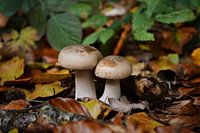 Twee paddenstoelen in het bos van Dorst, Noord-Brabant, Nederland. Tussen de herfstbladeren, is dit een echte herfst foto.