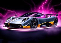 Gehuld in een magenta waas beweegt de donkergrijze Pagani Huayra zich als een mythe door een storm van rook en licht. Elke bliksemschicht werpt diepe schaduwen, waardoor hij een surrealistische gloed krijgt - half schaduw, half sterrenlicht. De lucht zoemt van de spanning terwijl dit beest door een wereld rolt die gevangen zit tussen schemering en droom.