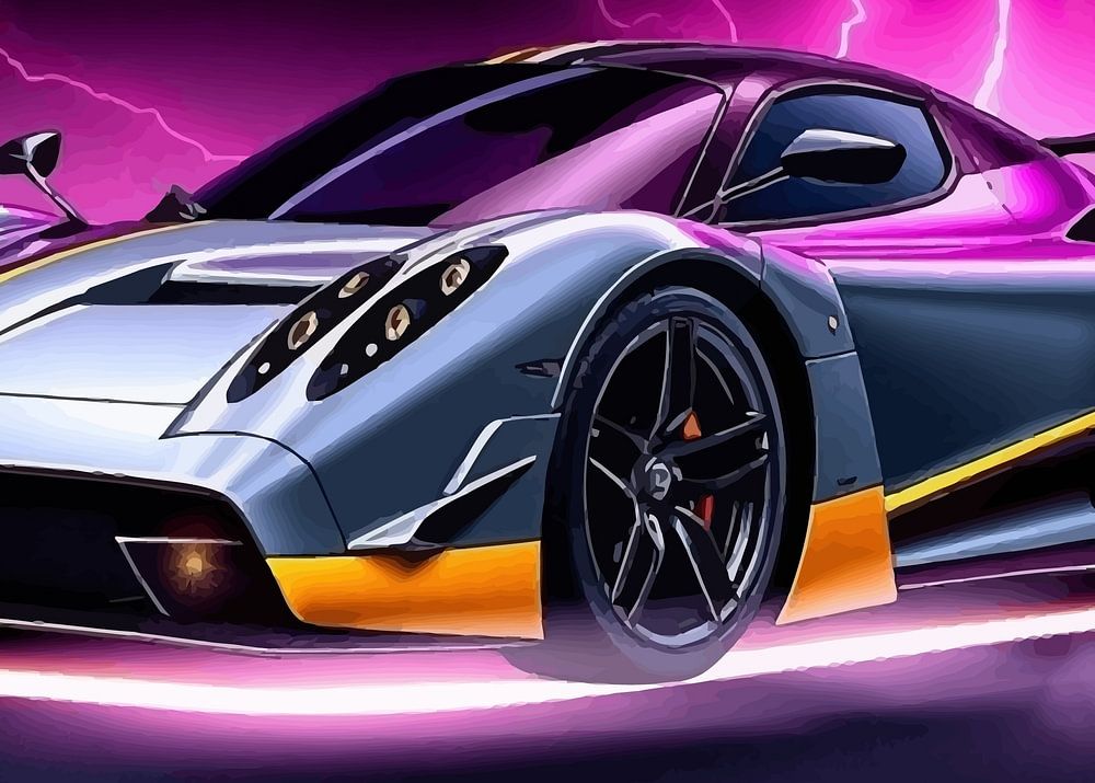 Gehuld in een magenta waas beweegt de donkergrijze Pagani Huayra zich als een mythe door een storm van rook en licht. Elke bliksemschicht werpt diepe schaduwen, waardoor hij een surrealistische gloed krijgt - half schaduw, half sterrenlicht. De lucht zoemt van de spanning terwijl dit beest door een wereld rolt die gevangen zit tussen schemering en droom.