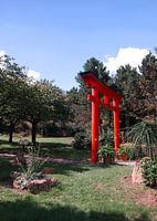 Het deel Japan ofwel Japanse tuin wordt gesierd met dit fraaie rode entrée . een echte eye catcher deze pagode doet het fraai in bijna elk interieur !