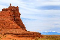 Moenave-zandsteen, een relatief zachte zandsteenlaag die zich goed leent om door erosie te worden gebeeldhouwd. Painted Desert en de San Francisco Peaks, Navajo Nation, Noord-Arizona, Verenigde Staten.