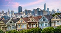1 van de vele hotspots in San Francisco, de "Painted Ladies", een kleurrijk rijtje met huizen met daarachter de imposante skyline van de stad