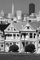 Een Zwart-Wit foto van Alamo Square, een park en een buurt in San Francisco. Aan de oostzijde van het park staan de zes beroemde victoriaanse huizen aan de Steiner Street, bekend als de Painted Ladies.