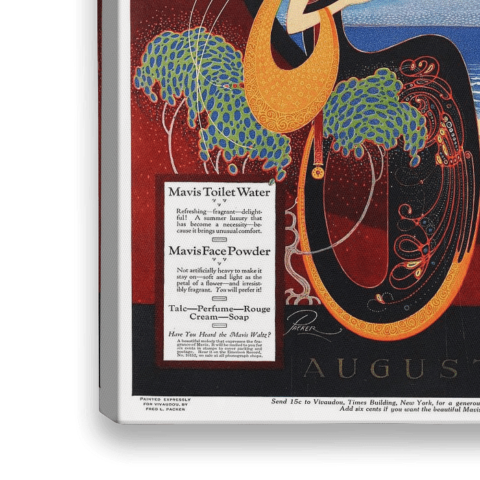 Deze reclameposter promoot een Franse make-up lijn. Het toont een vrouw in een weelderige jurk die op een balkon zit te genieten van het uitzicht op zee.