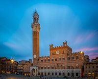 Een opname van het Palazzo Pubblico met de welbekende toren aan het Piazza Del Campo in Siena. Gemaakt in het blauwe uur na zonsondergang