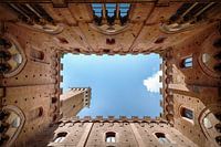 Omhoog kijkend is de toren Torro del Mangia zichtbaar.