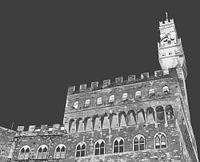 De afbeelding toont een historische klokkentoren in een Europese stad, omringd door aangrenzende gebouwen. De toren heeft een prominente wijzerplaat en een gekanteelde top, met een wapperende vlag op de top. De omringende architectuur bestaat uit een mix van stenen en stucwerk gevels, typisch voor het oude Europese stadsontwerp.