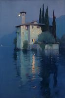 Het schilderij toont een majestueus Italiaans palazzo schilderachtig weerspiegeld in een kalm meer, geschilderd in de stijl van Arnold Böcklin. Het tafereel straalt een mysterieuze en sprookjesachtige sfeer uit die typerend is voor de werken van Böcklin. Het palazzo met zijn eenvoudige gevel rijst trots op boven het heldere water van…