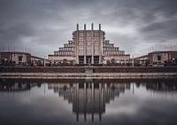 Moody scène met uitzicht op Paleis 5 van het Brussels Expogebouw. Het gebouw in Art Deco stijl weerspiegelt prachtig in het water in de voorgrond.