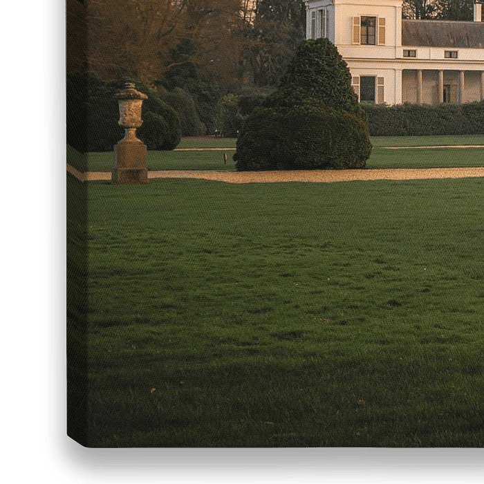 De avond valt over Paleis Soestdijk. De kleuren van de schemering geven mooie warmte aan het beeld.